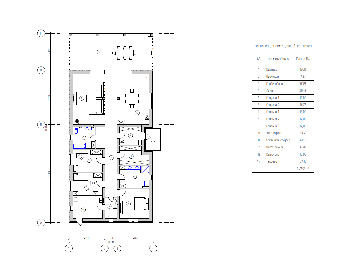 Одноэтажный дом из газоблока и кирпича49600 ₽Площадь 248 кв.м., 3 спальни, 2 санузла, гостиная-студияЗаказать